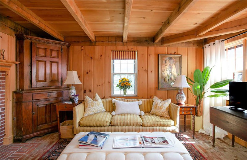Each and every design and architectural detail has been meticulously considered by acclaimed architectural firm Fairfax & Sammons of Palm Beach and New York. Truly one of a kind, this home is a masterful combination of new and repurposed elements positioned to feel authentic and historic. Built in 2019 with post and beam construction, this timber frame structure is composed mainly of locally sourced white oak. With thoughtful features like radiant heated brick floors, a beehive oven and mostly wood walls, ceilings and floors- it is certainly a rare and special residence. Enter through a beautifully crafted and large front door into the main level which offers a charming galley kitchen with dramatic picture window as well as an intimate living/dining room with a wall-to-wall wood burning fireplace. In the afternoon, the room glows in a golden afternoon light. The second floor has a generously sized primary suite featuring a gas fireplace, a walk-in closet, and an en-suite bath. A guest bedroom with both full bath and washer/dryer in the hall complete the second floor. The third floor features two additional bedrooms which share a Jack-and-Jill style bathroom. The dramatic black stained exterior of this home is further enhanced by a lovely English garden with Quince, Medlar and Apple tree plus a wonderful patio for outdoor dining and a unique, integral one-car garage and a crushed sea-shell driveway which fits a large SUV.